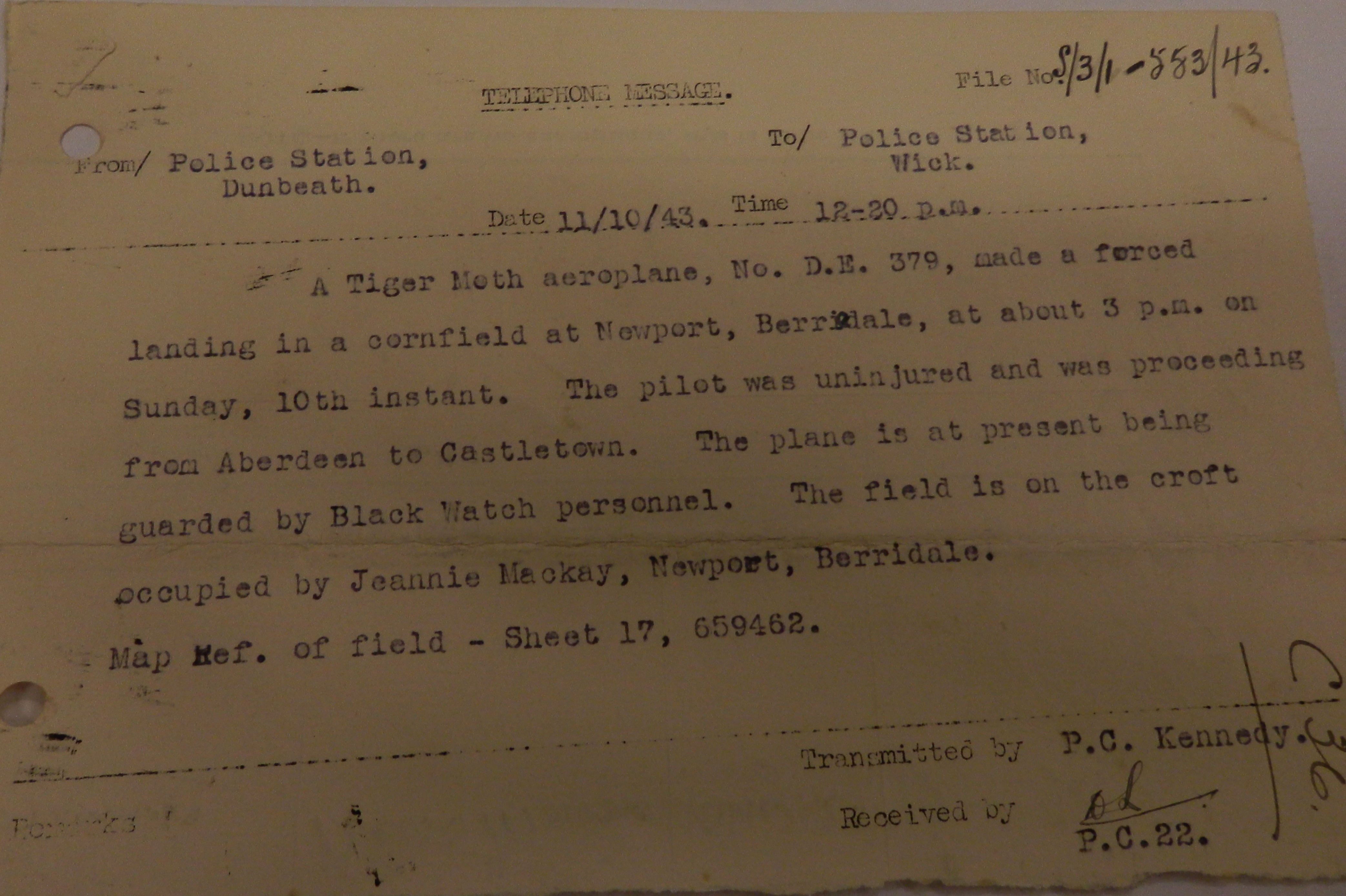 Tiger Moth aeroplane, No. D.H. 379, made a forced landing in a cornfield at Newport, Berriedale, at about 3 p.m. on Sunday 10th instant. The pilot was uninjured and was proceeding from Aberdeen to Castletown. The plane is at present being guarded by Black Watch personnel. The field is on the croft occupied by Jeannie Mackay, Newport, Berriedale.”