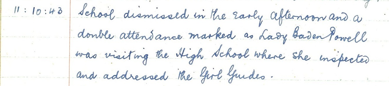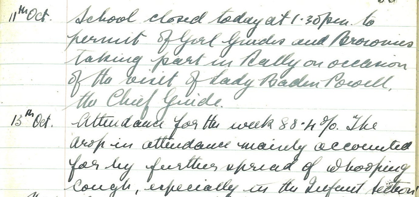 Powell, widow of the founder of the Scouting and Girl Guide movements and World Chief Guide, visited the town. The log book of Pulteneytown Academy records: “School dismissed in the early afternoon and double attendance marked as Lady Baden-Powell was visiting the High School where she inspected and addressed the Girl Guides.” The pupils of Wick North School were also given leave to attend: “School closed today at 1.30pm to permit of Girl Guides and Brownies taking part in Rally on occasion of the visit of Lady Baden-Powell the Chief Guide.” A couple of days later the head teacher noted, “Attendance for the week 88.4%. The drop in attendance mainly accounted for by further spread of whooping cough, especially in the Infant Section.”Finally this week, also on Monday 11 October, Dunbeath Police made the following report: “A