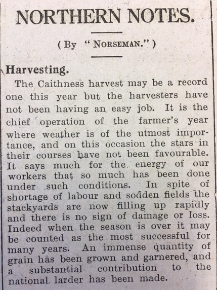 ‘Norseman’ in the John O’Groat Journal looked back on the summer harvest, a productive one despite the difficulties farmers had faced: “In spite of shortage of labour and sodden fields the stackyards are now filling up rapidly and there is no sign of damage or loss. Indeed when the season is over it may be counted as the most successful for many years. An immense quantity of grain has been grown and garnered.”The pupils of several Wick schools got an afternoon off on 11 October when Lady Baden-