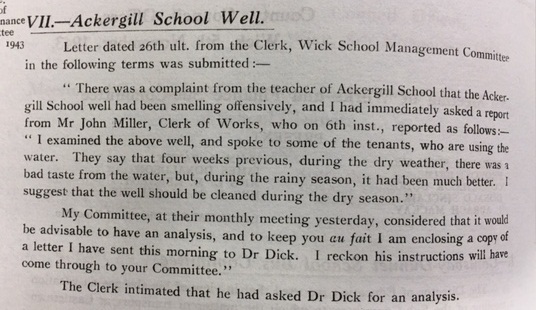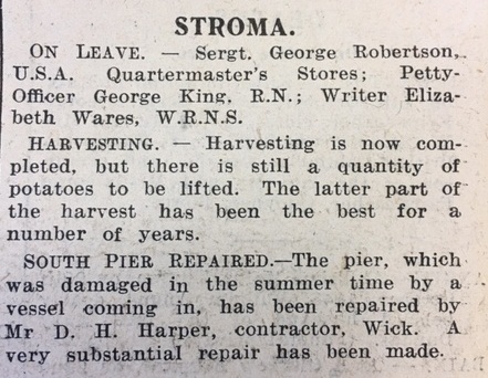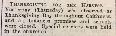 Back in Caithness the harvest was effectively over, and potato lifting was in full swing. As the John O’Groat Journal reported, on Stroma “Harvesting is now completed, but there is still a quantity of potatoes to be lifted. The latter part of the harvest has been the best for a number of years.” The paper also noted that “Yesterday (Thursday) was observed as Thanksgiving Day [for the Harvest] throughout Caithness, and all business premises and schools were closed. Special services were held in the churches.” In a further sign that the crisis period of the war had passed, the Council’s Education Committee noted that the county’s schools were now being released by the military, as they were no longer needed for the war: “It was reported that South School, Pulteneytown Academy and West Banks Public School had been surrendered as from 6th instant, and that the War Department Valuer was preparing a Schedule of Condition in respect of each school.” The wrangling over compensation and repairs would now begin. Finally this week, the Education Committee also considered the quality of water at Ackergill School: “There was a complaint from the teacher at Ackergill School that the Ackergill School well had been smelling offensively.” The Clerk of the School Management Committee had reported that “I examined the above well, and spoke to some of the tenants, who are using the water. They say that four weeks previous, during the dry weather, there was a bad taste from the water, but, during the rainy season, it had been much better. I suggest the well should be cleaned during the dry season.” The matter had also been referred to the County Medical Officer, Dr Dick.Coming soon! Week 219, 8th – 14th November 1943, will be published on Monday 7th November 2016. To view previous issues please use the menus on the right hand side of the page.