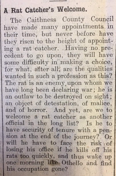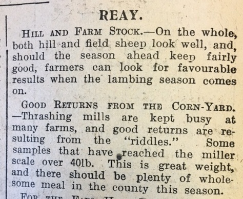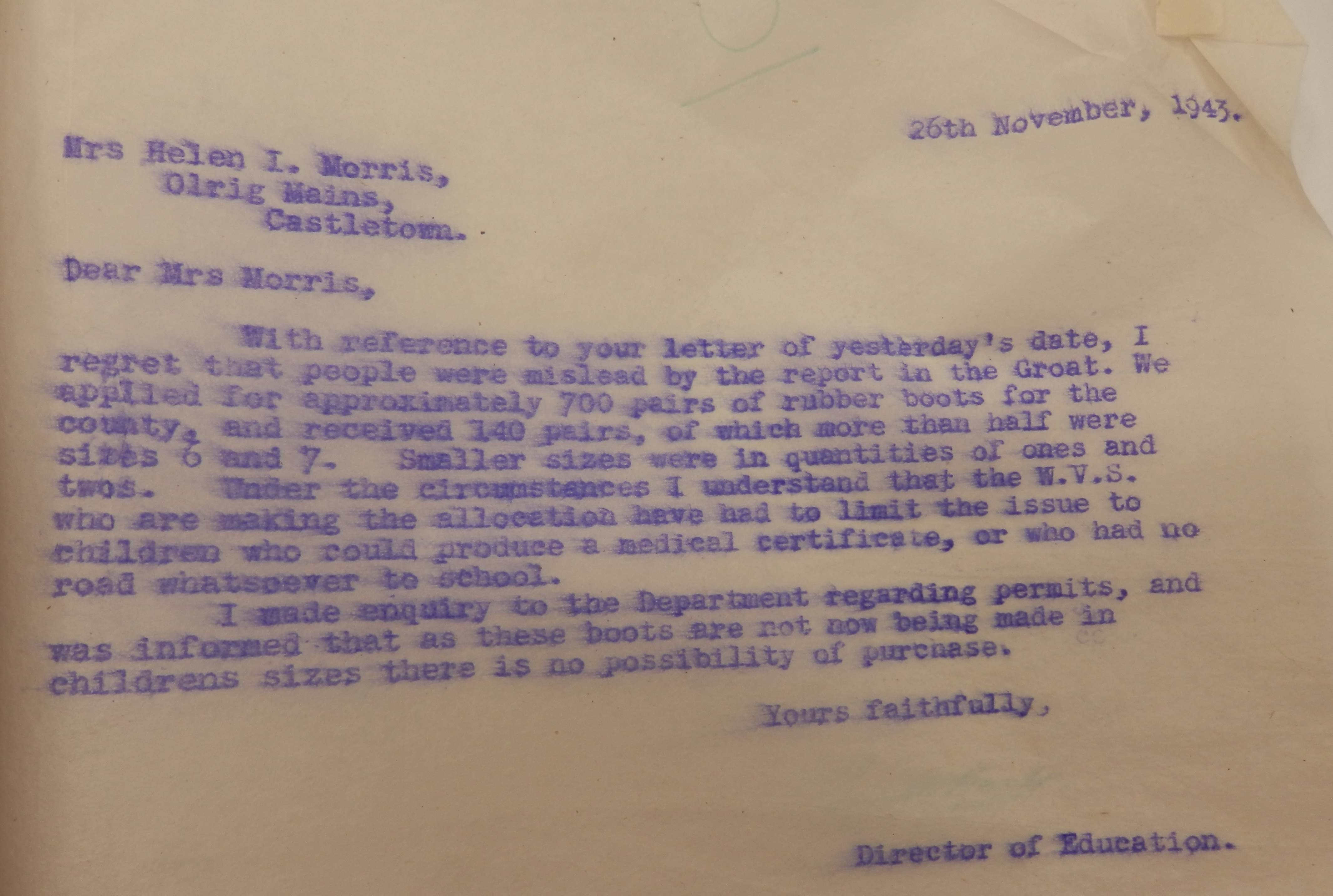 The John O’Groat Journal reported that farm work was going well in Caithness. In Reay, “both hill and field sheep look well and … farmers can look for favourable results when the lambing season comes on”. In the corn-yard, “threshing mills are kept busy at many farms, and good returns are resulting from the “riddles” [threshing sieves]. Some samples that have reached the miller scale over 40lb.” Attendance at Gillock School in Bower was still being affected by illness. The head teacher wrote in the log book on 26 November: “In spite of exceedingly stormy weather the 16 pupils in attendance have perfect attendance this week… There are 4 defaulters [including one] family who are still suffering from whooping cough”. Last week the John O’Groat Journal had reported that rubber boots would be supplied to schoolchildren. On 26 November the Director of Education had to write a letter clarifying the situation: “We applied for approximately 700 pairs of rubber boots for the county, and received 140 pairs, of which more than half were sizes 6 and 7. Smaller sizes were in quantities of ones and twos. Under the circumstances I understand that the W.V.S. who are making the allocation have had to limit the issue to children who could produce a medical certificate, or who had no road whatsoever to school.” Caithness County Council debated the sad case of the death of a horse belonging to William Morris, farmer, of Olrig Mains: “during the previous night a three-year-old filly belonging to him had gone into a hole opened by the Sexton, Olrig Burial Ground, in a field adjoining the Burial Ground, and was found dead next morning.” Apparently the sexton had made the hole to clear a choked drain; but when invited to a meeting to explain the situation, “the Sexton did not appear”. The Council accepted liability, felt that the compensation Mr Morris requested was fair, and resolved to take the matter up with their insurers.” Finally this week, Norseman in the John O’Groat Journal reflected on the Council’s decision to employ a rat catcher. In particular he speculated on whether the successful applicant would receive a pension – “Or will he have to face the risk of losing his office if he kills off his rats too quickly, and thus wake up one morning like Othello and find his occupation gone?”Coming soon! Week 222, 29th November – 5th December 1943, will be published on Monday 28th November 2016. To view previous issues please use the menus on the right hand side of the page.