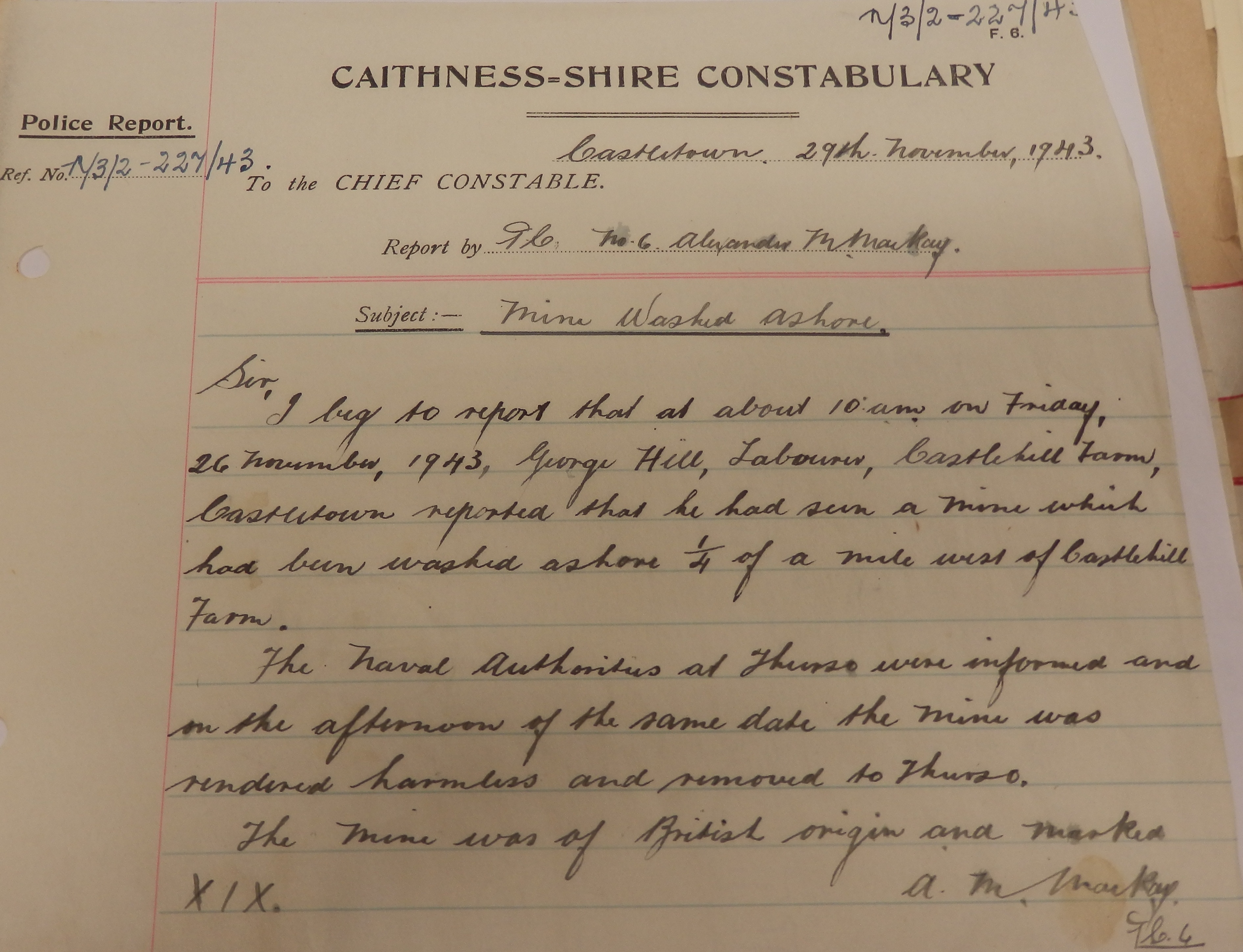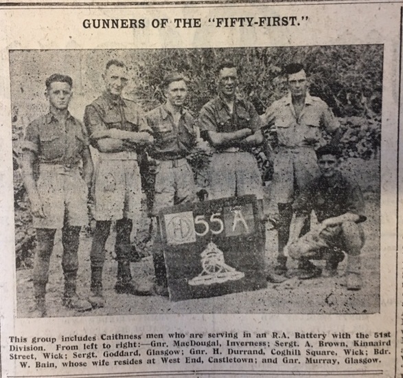 In Caithness, some schools were getting ready for Christmas. Freswick School log book has the following entry for 3 December: “We have begun learning a few carols and songs for the Xmas Treat. Again this week there was perfect attendance.” The logistics of providing rubber boots to the county’s school children was proving far from straightforward. The head teacher of Gillock School, after recording that “The annual service of the “Week of Witness” was held on Wednesday afternoon from 2 p.m. to 3:30 by Rev. C. Smith & Rev. D.M. McEchern”, made the following sardonic note in the logbook: “The wellington boots for this school have been sent to Bower.” The John O’Groat Journal carried an account of the annual general meeting of the Caithness Moral Welfare Committee. The secretary reported that, “In many cases it was found that the results of illegitimacy were regarded as a nuisance rather than with any sense of moral responsibility. The Committee had been doing what they could by publishing appeals for a higher sense of moral conduct and obligation”. On 29 November Constable Mackay at Castletown reported “that at about 10 am on Friday, 26 November, 1943, George Hill, labourer, Castlehill Farm, reported that he had seen a mine which had been washed ashore ¼ of a mile west of Castlehill Farm. The Naval Authorities at Thurso were informed and … the mine was rendered harmless and removed to Thurso.” Finally this week, the John O’Groat Journal featured another photograph of soldiers fighting overseas: “This group includes Caithness men who are serving in an R.A. [Royal Artillery] Battery with the 51st Division.” Among those in the photograph are Sgt A. Brown, Kinnaird Street, Wick; Gunner H. Durrand, Coghill Square, Wick; and Bombardier W. Bain, “whose wife resides at West End, Catletown.”Coming soon! Week 223, 6th – 12th December 1943, will be published on Monday 5th December 2016. To view previous issues please use the menus on the right hand side of the page.