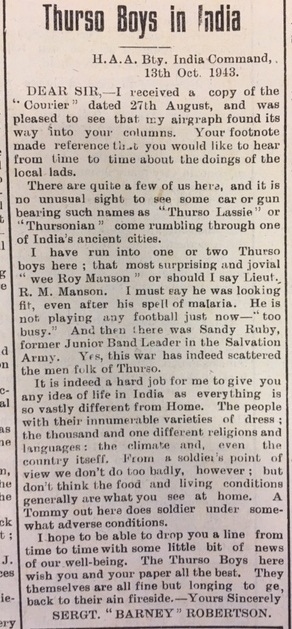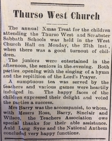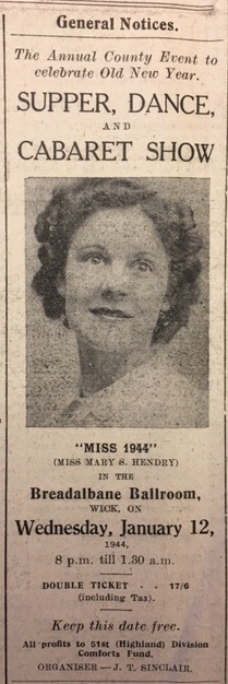 And so Caithness prepared to welcome in its fifth year of war. The Caithness Courier reported that the children attending Thurso West and Scrabster Sabbath Schools had their annual Xmas Treat on 27 December at the West Church Hall: “The juniors were entertained in the afternoon, the seniors in the evening. Both parties opened with the singing of a hymn and the repetition of the Lord’s Prayer. A sumptuous tea was served by the teachers and various games were heartily indulged in. The happy faces of the children expressed their delight and voted the parties a success.” Also in the Courier was a letter from Sergeant “Barney” Robertson, with news of the “Thurso Boys in India”: “There are quite a few of us here, and it is no unusual sight to see some car or gun bearing such names as “Thurso Lassie” or “Thursonian” come rumbling through one of India’s ancient cities.” Sgt Robertson goes on to mention Lieutenant R.M. Manson (“wee Roy Manson”) and Sandy Ruby, former Junior Band Leader in the Salvation Army, before concluding: “The Thurso Boys wish you and your paper all the best. They themselves are all fine but longing to ge back to their ain fireside.”Finally this week, as our thoughts turn to the New Year, the John O’Groat Journal contained an advertisement recently for the Annual County Event to celebrate Old New Year on 12 January with a supper, dance and show at the Breadalbane Ballroom (“keep this date free”). “Miss 1944” was Miss Mary S. Hendry. All profits would go to the 51st (Highland) Division Comforts Fund.