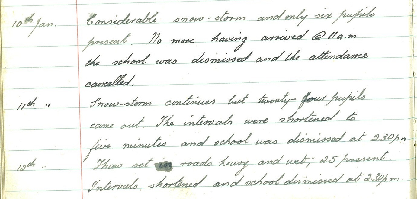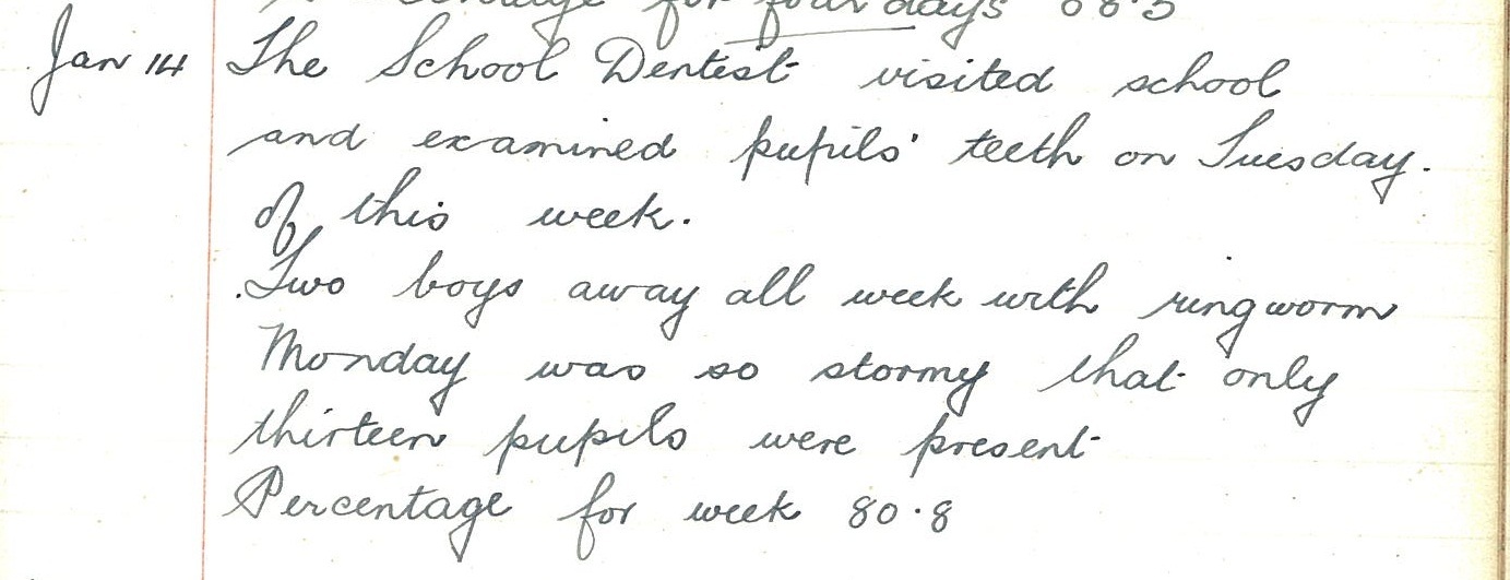 Finally this week, the pupils of Ackergill School were up against in more ways than one. The log book records, “The School Dentist visited school and examined pupils’ teeth on Tuesday of this week. Two boys were away all week with ringworm. Monday was so stormy that only thirteen pupils were present.”