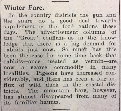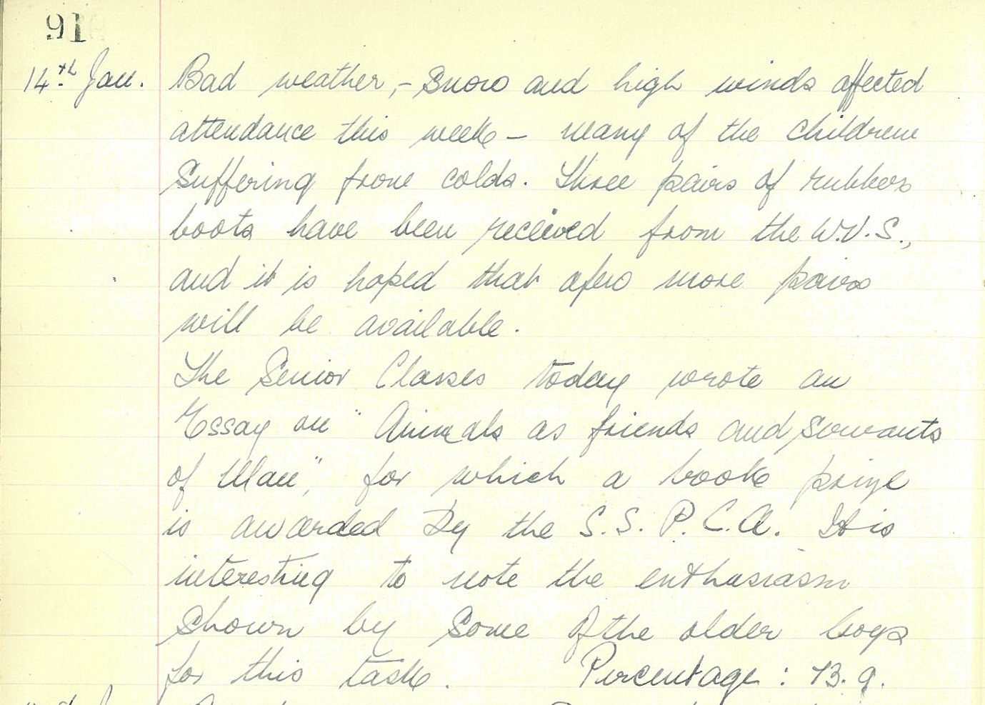 supplementing the food rations these days… [and] rabbits – once treated as vermin – are now a scarce commodity in many localities. Pigeons have increased considerably, and there has been a fair influx of wild duck in the coastal districts.” Otherwise, the main story of the county this week was bad weather. Bower experienced a heavy snowfall: the school log book records that on the 10th January, “Considerable snow-storm and only six pupils present. No more having arrived @ 11.00am the school was dismissed and the attendance cancelled.” Next day, “Snow-storm continues but twenty-four pupils came out… The school was dismissed at 2.30pm.” Finally on the 12th the entry reads, “Snow set in roads heavy and wet; 25 present… school dismissed at 2.30pm.”There was rough weather in Canisbay too. The head teacher recorded in the log book on 14 January: “Bad weather – snow and high winds affected attendance this week – many of the children suffering from colds. Three pairs of rubber boots have been received from the W.V.S., and it is hoped that a few more pairs will be available.”
