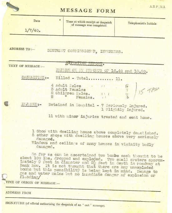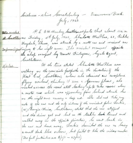 People’s War” project, remembering playing outside that day and being injured, and the aftermath: http://www.bbc.co.uk/history/ww2peopleswar/stories/19/a2032219.shtml Suddenly any plane was a potential threat. On Friday 5 July at 11.00am, Charlotte MacPhee, aged 62, a “tinkler” [i.e., tinker] from Weydale, Thurso, was walking on the footpath opposite Donald Finlayson’s cycle shop in Castletown. She observed an aeroplane flying overhead and, “thinking it was a German plane, she rushed across the road still looking up to take cover”, only to be struck by a motor car coming up the road. Luckily she only received a cut on the arm, but it shows the change in mood: no one was safe any more.