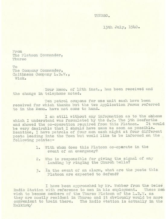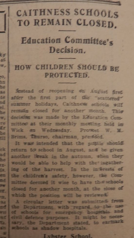of visiting, and warned him of the risk from air raids: “this place is meantime not one of those which people go unless they need to.” Also this week, the Education Committee considered a suggestion that schools, such as the new school at Lybter, should act as emergency, or “shadow” hospitals. The committee unanimously decided that Lybster School should be left alone “in the interests of the education of the school children”, and that Langwell Lodge, Berriedale, would do instead. Meanwhile, owing to the air raids and the expectation of an imminent invasion of the country they decided to keep the schools closed for another month and not reopen them on 1 August as originally planned.The Local Defence Volunteers were also readying themselves for a German invasion. On 13 July D. Keith Murray,
