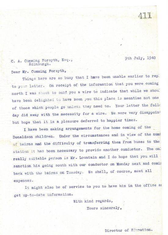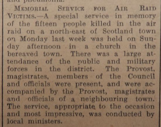 In Caithness, a memorial service was held on Sunday for the 15 victims of the air raid the previous week. As the John o’Groat Journal reported, “There was a large attendance of the public and military forces in the district,” and the Provost, magistrates, members and officials from both Wick and Thurso attended.The Director of Education wrote on 9 July to a correspondent in Edinburgh who was thinking