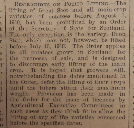 Thurso Platoon Commander, wrote a letter asking for clarification on what to do if the enemy landed: “Who is responsible for giving the signal of any landing by ringing the church bells? In the event of an alarm, what are the posts this Platoon are expected to defend?” And pointing out that although they had received 15 additional rifles, they hadn’t had any extra ammunition. Finally, anyone who feels that Government nowadays interferes too much in our lives should spare a thought for farmers in 1940. As the John o’Groat Journal reported, “The lifting of Great Scot and all main-crop varieties of potatoes before August 1, 1940, has been prohibited by an Order of the Secretary of State for Scotland”. At a time when food was scarce, every potato had to play its part in the war effort and achieve its “maximum weight”!