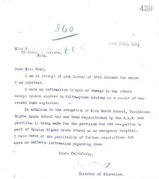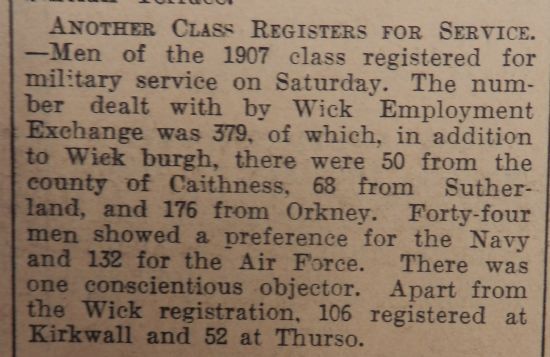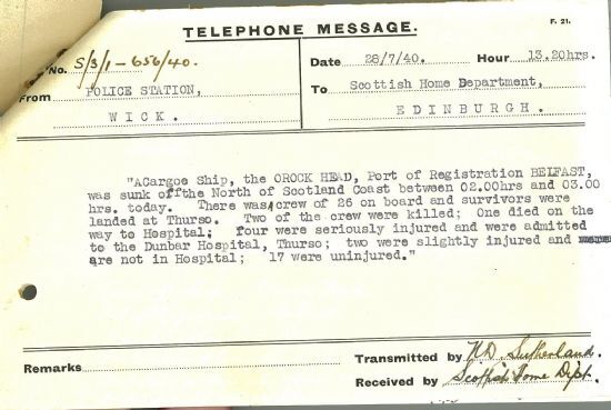 of the 1907 class”: 379 men enrolled in Wick, including 68 from Sutherland and 176 from Orkney. Of these, 44 showed a preference for the navy, 132 for the RAF; there was one conscientious objector. Merchant seamen whose ships had been sunk by the German blockade were still being landed in Thurso, as the cost of keeping Britain supplied with food and raw materials mounted. On 28 July the Caithness Police recorded that the Crock Head, a cargo ship, had been sunk in the early hours of the morning: “There was a crew of 26 on board and survivors were landed at Thurso. Two of the crew were killed; one died on the way to hospital; four were seriously injured and were admitted to the Dunbar Hospital, Thurso; two were slightly injured and are not in hospital; 17 were uninjured.”In response to a query about school buildings, on 22 July the Director of Education wrote that the only damage so