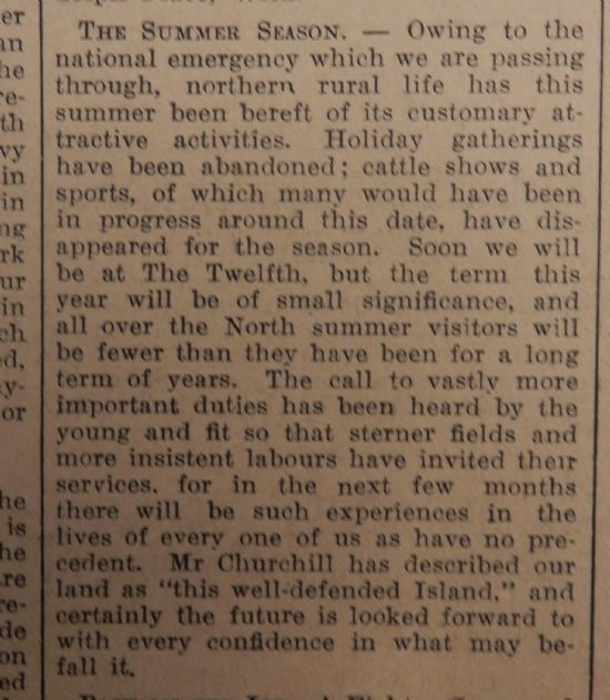 The John o’Groat Journal this week reflected on the impact of the war on “northern rural life”, especially on local activities and customs: “Holiday gatherings have been abandoned; cattle shows and sports, of which many would have been in progress around this date, have disappeared for the season. Soon we will be at the Twelfth, but the term this year will be of small significance, and all over the North summer visitors will be fewer than they have been for a long term of years.”And still conscription continued: another round of registration for national service took place this week, of “men