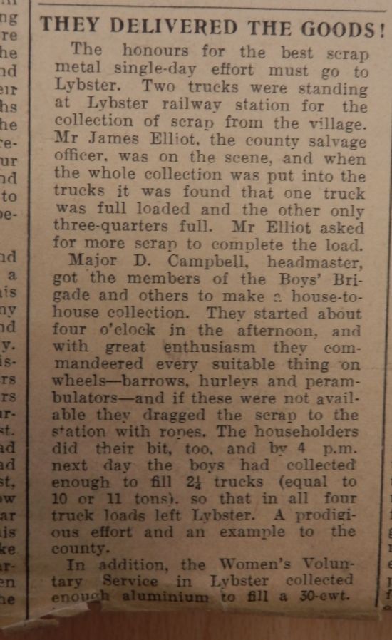 far to any Caithness schools was “broken windows in Pulteneytown Academy as a result of the recent bomb explosion” [of Bank Row on 1 July]. He added that both Wick North School and Castletown Higher Grade School had been occupied by the R.A.F. and, despite the ruling of the education committee a couple of weeks ago, “provision is being made for the provision of Lybster Higher Grade School as an emergency hospital”. Finally this week, the John o’Groat Journal reported a remarkable scrap metal drive in Lybster. Two railway trucks had been provided for the village’s scrap, but when all the scrap was loaded one was still a quarter empty. So the Boys’ Brigade started a house-to-house collection to make up the deficit, and “commandeered every suitable thing on wheels – barrows, hurleys and perambulators – and if these were not available, they dragged the scrap to the station with ropes”. By the time they’d finished, Lybster, instead of filling two trucks, had filled no less than four.