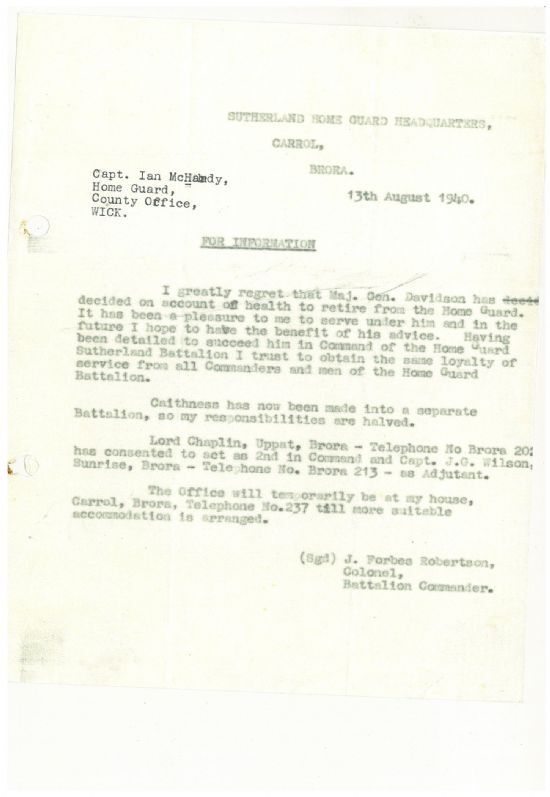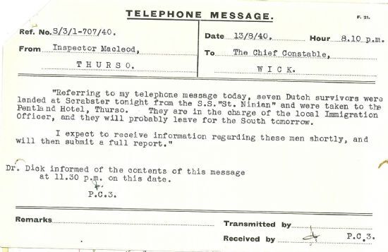 Meanwhile, German attacks on merchant shipping off the coast of Caithness continued unabated, leading to a steady stream of refugees passing south. On 13 August the police recorded that “seven Dutch survivors were landed at Scrabster tonight from the S.S. “St. Ninian” and were taken to the Pentland Hotel, Thurso. They are in the charge of the local Immigration Officer, and they will probably leave for the South tomorrow”.This week the Caithness Home Guard was formed into a separate Battalion, following the retirement of the previous commander of the joint Sutherland and Caithness Home Guard.