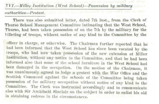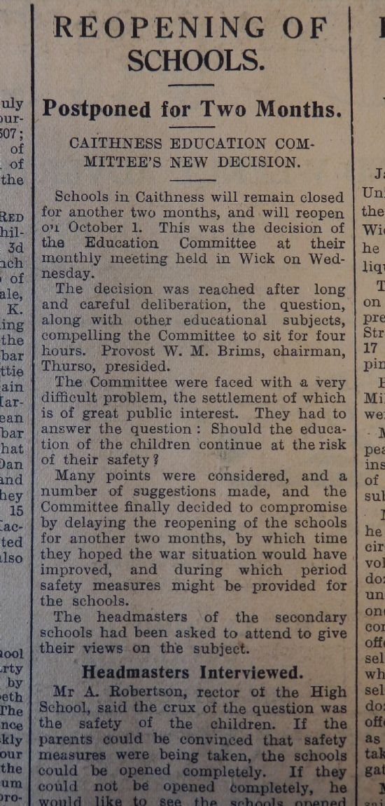 previous month: one case of preserved meat; two cases of biscuits; two tins of tea; two tins of sugar; three tins of cheese; seven tins of jam; and seven tins of condensed milk. (Of course, it doesn’t say how long the rations were supposed to last!) Meanwhile schools in Caithness, which had broken up for the summer holidays back in June, would now remain closed until 1 October, “by which time they hoped the war situation would have improved, and during which period safety measures might be provided for the schools”.Finally this week, the County Education Committee learned that “the West School, Thurso,