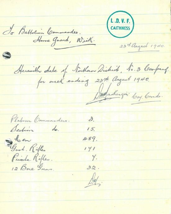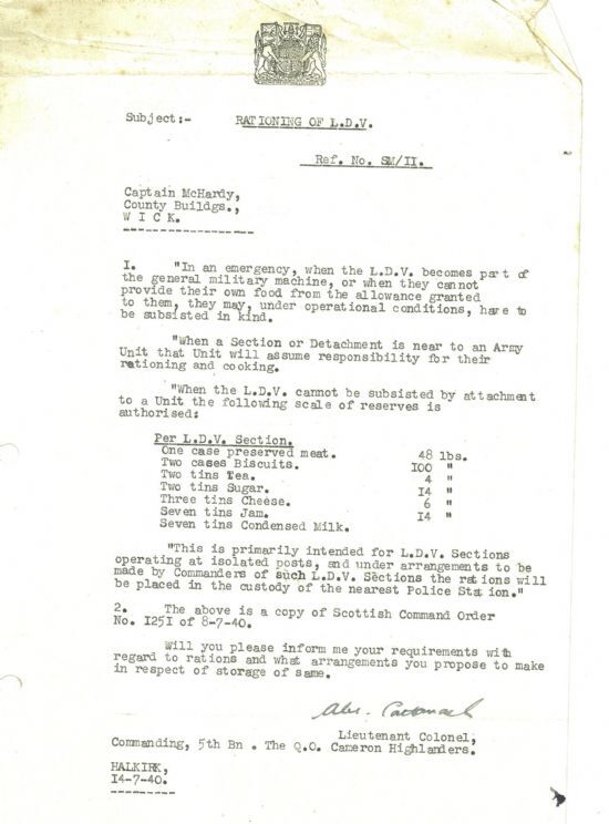 The Home Guard was organised into districts and companies. The Caithness Northern District at this time had some 489 men serving in it, divided into 3 platoons, and 15 sections, with each section consisting of some 30 men.The rations for a section operating at isolated posts in an emergency had been laid down the
