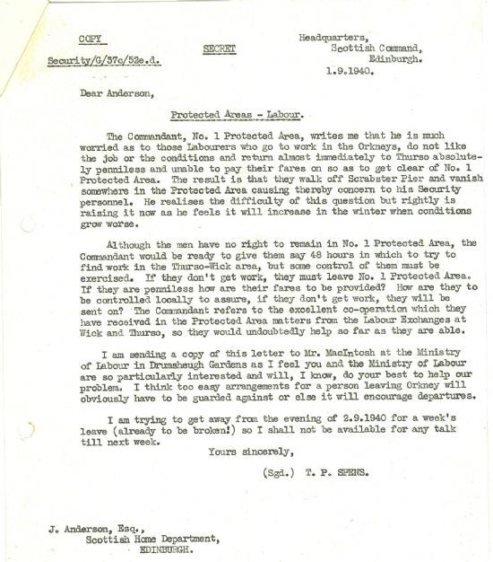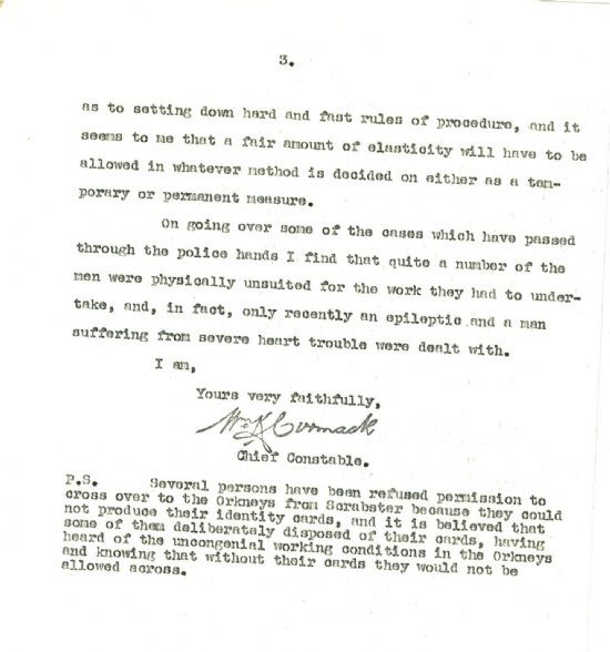 Orkneys, and do not like the work or conditions and return immediately to Thurso absolutely penniless and unable to pay their fares… The result is that they walk off Scrabster Pier and vanish somewhere.” The officials were surprisingly sympathetic to the labourers: “I find that some of the men were physically unsuited for the work they had to undertake, and, in fact, only recently an epileptic and a man suffering from severe heart trouble were dealt with.” (They also noted that some men were suspected of throwing away their permits, “having heard of the uncongenial working conditions in the Orkneys”, so that they wouldn’t be allowed in.)