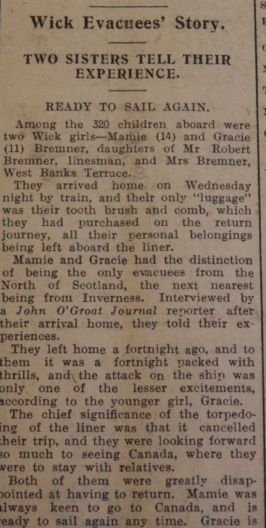 The John o’Groat Journal recounted the dramatic story of two Wick sisters, Mamie and Gracie Bremner, who were on a ship of 320 children being evacuated to Canada when it was sunk by a German submarine. All the children survived (singing “Roll out the Barrel” as they took to the lifeboats), most of them in pyjamas, having been forced to leave all their possessions behind; when Mamie and Gracie arrived home, all they had was a tooth brush and comb, which they’d bought on the way.
