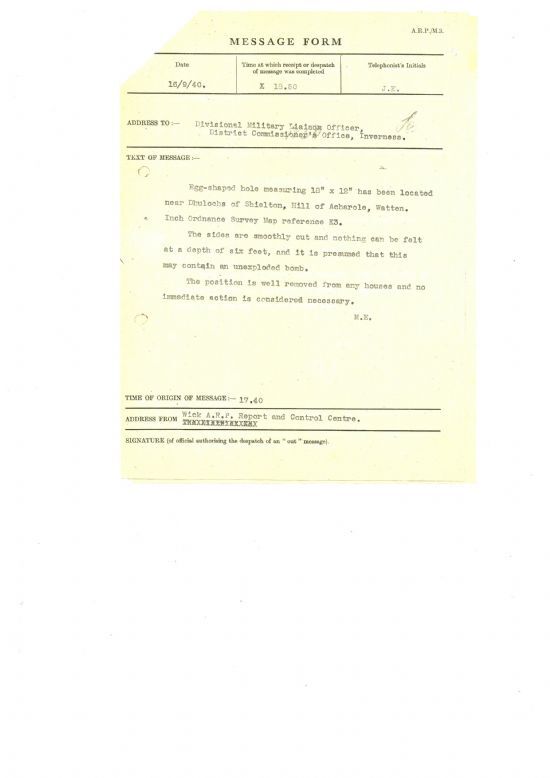 Meanwhile, no one in Britain knew that the invasion had cancelled, and the Home Guard and the Auxiliary Military Police (“AMPs”) were making preparations for the defence of Watten. “Colonel Manuel of the AMPs at Watten came to see me today, he had been stirred up by a war Brigadier, who apparently arrived on Saturday to arrange with me for the defence of Watten. As a result of our conference the AMPs are going to man posts at Watten Mills, in Crutie’s grounds, near Bank’s Lodge, & commanding the main road bridge from the Watten side. The Home Guard with their 14 rifles are taking up position to command the Camster Road & the main road bridge from the Wick side. The AMPs are going to make some swing road blocks.”Also in Watten, an unexploded bomb was reported to the police on 16 September: “Egg-shaped hole measuring 18” by 12” has been located near Dhulochs of Shielton, Hill of Acharole, Watten… The sides are smoothly cut and nothing can be felt at a depth of six feet, and it is presumed that this may contain an unexploded bomb. The position is well removed from any houses and no immediate action is considered necessary.”