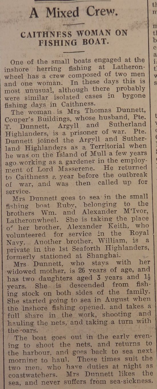 Finally this week, the war continued to force shocking changes on all aspects of Caithness life, and the fishing industry was no exception: the John o’Groat Journal featured a story about a Latheronwheel fishing boat that now had a woman crew member! The boat was the Ruby, and the woman was Mrs Dunnett, aged 26, whose husband was a prisoner of war; she was taking the place on the boat of her brother, Alexander Keith, who was serving in the navy. “She … takes a full share in the work, shooting and hauling the nets, and taking a turn with the oars.” The paper also reassured its readers that “Mrs Dunnett likes the sea, and never suffers from sea-sickness.”