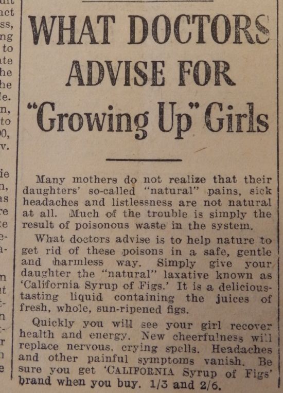 Doctors Advise for “Growing Up” Girls: Many mothers do not realise that their daughters’ so-called “natural” pains, sick headaches and listlessness are not natural at all. Much of the trouble is simply the result of poisonous waste in the system … Simply give your daughter the “natural” laxative known as “California Syrup of Figs” … Quickly you will see your girl recover health and energy. New cheerfulness will replace nervous, crying spells. Headaches and other painful symptoms vanish…”
