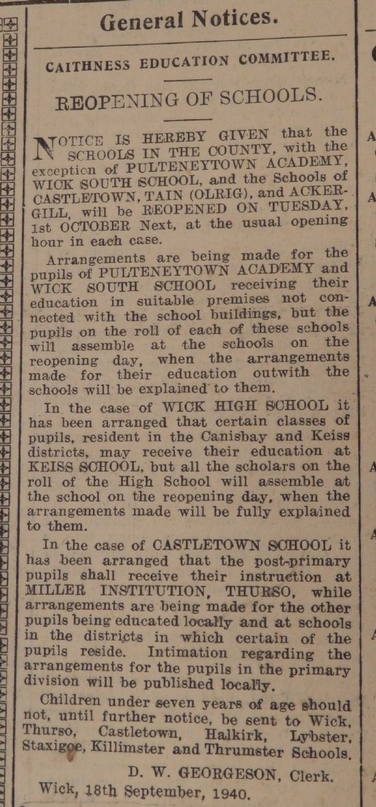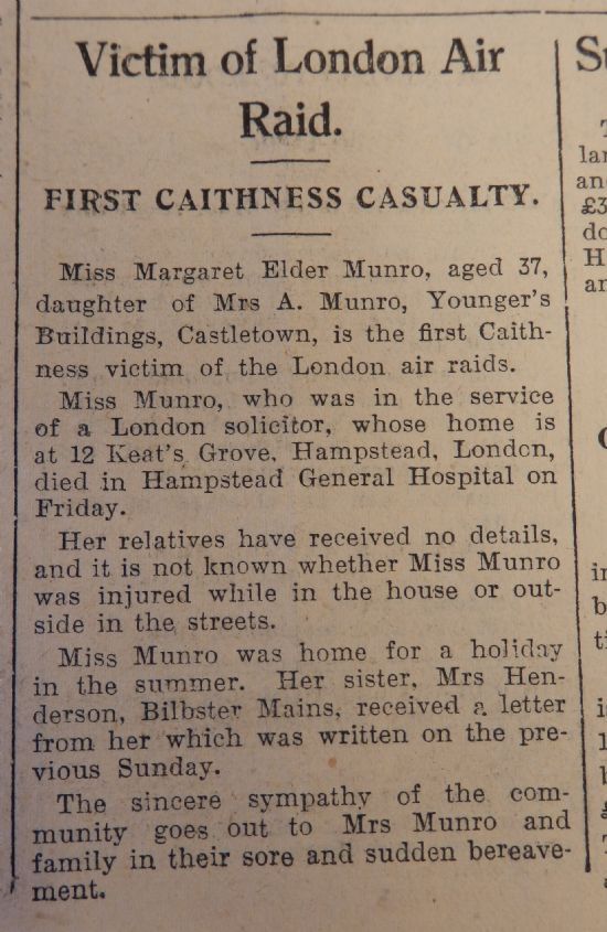 The “Blitz” of English cities such as London, and the destruction and loss of life they caused, touched Caithness this week, as the John o’Groat Journal reported the first victim from Caithness, Miss Margaret Elder Munro, aged 37, of Castletown. She was working for a London solicitor and was living in Hampstead at the time. The Commonwealth War Graves Commission record of her death states: “Of 12 Keats Grove [Hampstead]. Daughter of Alexander and Isabella Munro, of Younger’s Buildings, Castletown, Caithness-shire. Injured at 12 Keats Grove; died same day at Hampstead General Hospital.”Meanwhile, in Caithness, the long school summer holiday (schools had broken up in June) was finally at an end.