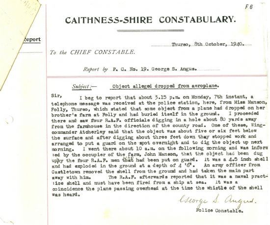 Finally, a curious incident happened at Folly Farm, Thurso, this week: a plane had passed overhead, and at the same time an object hit the ground, buried itself in it, and detonated (though without injuring anyone). The R.A.F. came and dug down to a depth of four and a half feet, only to find a 4.5-inch naval practice shell. It seems to have been fired from a ship at sea, and “it was a coincidence the plane passing overhead at the time the whistle of the shell was heard.”