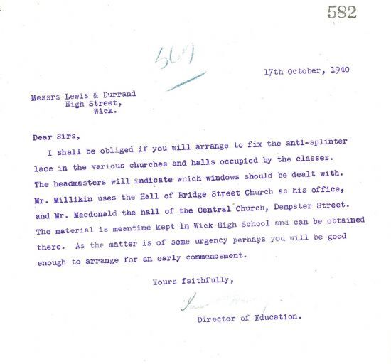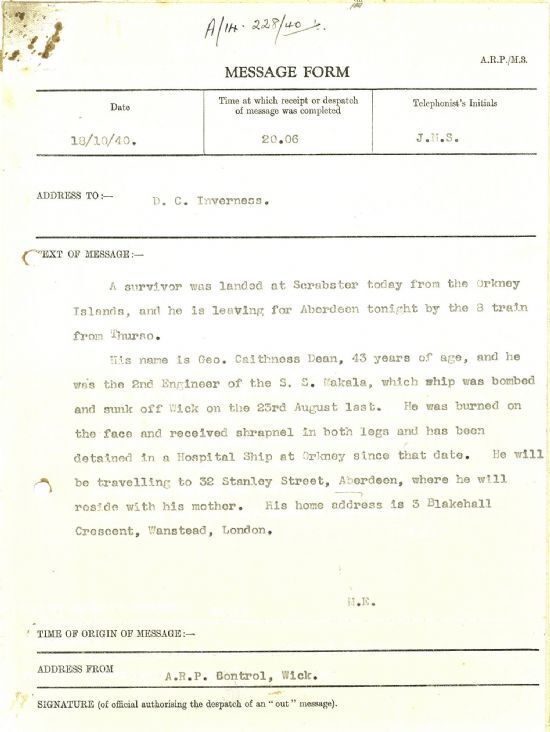 Now that Caithness schools were finally back, the safety of the children was obviously a key concern. It says a lot about the sense of danger from bombs that the Director of Education this week wrote for the “anti-splinter lace in the various churches and halls occupied by the classes” to be replaced, as a matter of urgency. As events would prove, within a few weeks that lace would be needed.On 18 October a severely wounded survivor from a sunk merchantman landed at Scrabster on his way to his mother’s at Aberdeen,. “His name is Geo. Caithness Dean, 43 years of age, and he was the 2nd Engineer of the S.S. Makala, which ship was bombed and sunk off Wick on the 23rd August last. He was burned on the face and received shrapnel in both legs and has been detained in a Hospital Ship at Orkney since that date.”