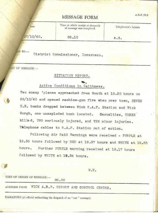 In the police files is a record of the stark message from the Wick Control Office: “We are being bombed.”Next day, the situation report read: “Two enemy planes approached from South at 18.20 hours on 26/10/40 and opened machine-gun fire when over town, SEVEN H.E. bombs dropped between Wick R.A.F. Station and Wick Burgh, one unexploded bomb located. Casualties, THREE killed, TWO seriously injured, and TEN minor injuries. Telephone cables to R.A.F. Station out of action.”