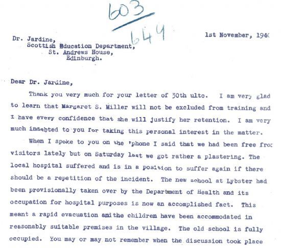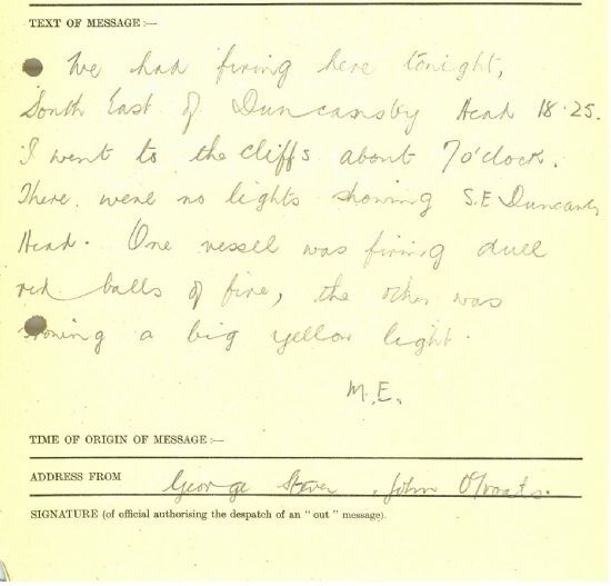 “In Caithness, Mr M’Hardy, Director of Education, wrote to a correspondent about the recent bombing of Wick. “When I spoke to you on the ‘phone I said that we had been free from visitors lately but on Saturday last we got rather a plastering. The local hospital” [i.e., Bignold Cottage Hospital] “suffered and is in a position to suffer again if there should be a repetition of the incident. The new school at Lybster had been provisionally taken over by the Department of Health and its occupation for hospital purposes is now an accomplished fact.”On 6 November John O’ Groats ARP post reported to ARP Control: “We had firing here tonight, South East of Duncansby Head 18.25. I went to the cliffs about 7 o’clock. There were no lights showing SE Duncansby Head. One vessel was firing dull red balls of fire, the other was showing a big yellow light.”