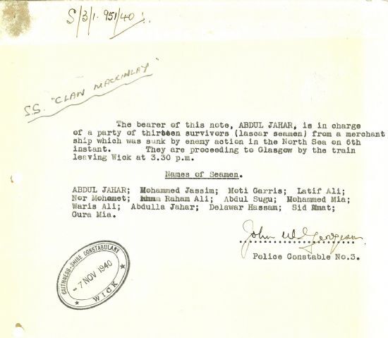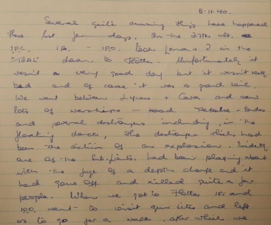 In the seas off Caithness, the toll on merchant shipping continued to mount. On 7 November Caithness Constabulary issued a pass to one Abdul Jahar and 13 survivors of the merchant ship SS Clan Mackinlay, sunk by enemy action the day before. They were talking the train from Wick to Glasgow. Finally this week, Hetty Munro over in Orkney recorded in her diary that she and a friend took a break from war work and went for a sail with a colleague down to Flotta. “We went between Lyness and Cava and saw lots of warships – Hood, Repulse, Didos and several destroyers – including, in the floating dock, the destroyer which had been the victim of an explosion. Evidently one of the sub-lieutenants had been playing about with the fuse of a depth charge and it had gone off and killed quite a few people.” They went for a walk and did some fishing, and got back around 6 pm: “A most enjoyable day altogether.”