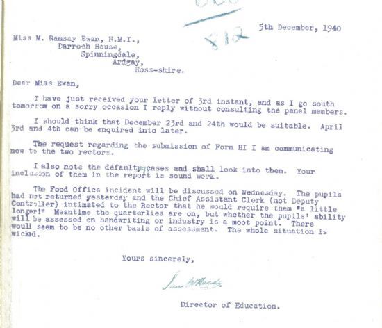 Meanwhile, the Director of Education was outraged to discover that some children had been taken to work in the local Food Office when they should have been taking exams. On 5 December he wrote, “The pupils had not returned yesterday and the Chief Assistant Clerk … intimated to the Rector that he would require them ‘a little longer!’ Meantime the quarterlies are on, but whether the pupils will be assessed on handwriting or industry is a moot point … The whole situation is wicked.”Finally this week, the John O’Groat Journal noted the restriction in the rules for burning heather, which could