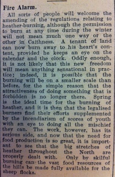 now be done in the winter during the hours of daylight, and had previously been against the law. The reporter pointed out that it “will not mean much one way or the other in Caithness”; but added “indeed, it is possible that the burning will be on a smaller scale than before, for the simple reason that the attractiveness of doing something that is forbidden is no longer there.”