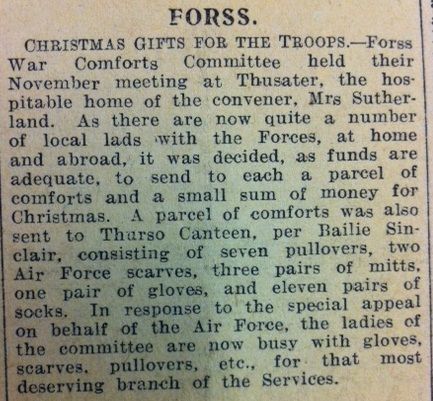 Far from the heat of the North African desert, the John O’Groat Journal noted that the arrival of December meant that “Winter has now got the North in its iron grip”. However, “In spite of the black-out Wick can be quite a gay place during the hours between the dusk and dawn … Picture-houses, dance halls, concert rooms, library facilities, and a host of other amenities make Wick quite an attractive place once the drab out-of-doors is forgotten.”With winter already here, and Christmas coming, all over the county people were busy fundraising, knitting and gathering “comforts” for the troops. These were usually balaclavas, scarves, gloves, socks, jumpers and blankets, and were often sent with packs of sweets and cigarettes, or money. The Forss War Comforts Committee was typical: “As there are now quite a number of local lads with the Forces, at home and abroad, it was decided as funds are adequate, to send to each a parcel of comforts and a small sum of money for Christmas.”