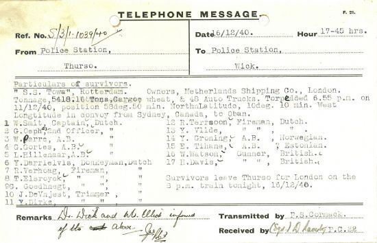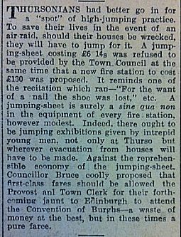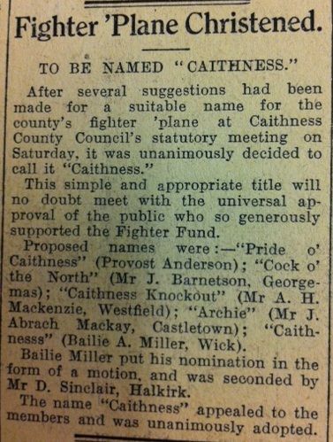 The county had raised almost £6,000 earlier in the year to pay for a Spitfire; now came the news that it was to be christened. The County Council unanimously decided to name it “Caithness”. (The other names which had been proposed were: “Pride o’ Caithness”; “Cock o’ the North”; “Caithness Knockout”; and “Archie”.) It would take another couple of months for the plane to come into service, in February 1941, and when it did the John O’Groat Journal included a photograph, complete with “Caithness” emblazoned beneath the cockpit. Another group of survivors came through Thurso this week, after the SS Towa of Rotterdam travelling in convoy from Canada to Oban (with a cargo of “wheat and 48 auto trucks”) was torpedoed on 11 December. Among the Dutch crew of 17 was one Y. Darrielvis, whose occupation was a “donkeyman”: the steam engine on a ship to operate the winch was called a donkey engine, and so the operator was known as a donkeyman. Finally this week, the John O’Groat Journal sarcastically recommended that residents of Thurso start practicing the high-jump, because the Town Council had refused to buy a jumping sheet for the use of the Fire Brigade, even though it only cost £6 14s. By way of contrast, it had been proposed at the same meeting that the Provost and Town Clerk travel to a meeting in Edinburgh by first class rail (“a waste of money at the best, but in these times a pure farce”). As for the people of Thurso, “to save their lives in the event of an air raid, should their houses be wrecked, they will have to jump for it”.
