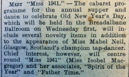 January) would be held: It “will include several novelty items in addition to the appearance of Miss Mabel Neil, Glasgow, Scotland’s champion tap-dancer. Chief interest, however, will centre round “Miss 1941” (Miss Isobel Macgregor) and her associates, “Spirit of the Year” and Father Time”.”