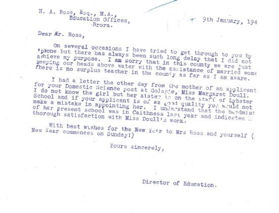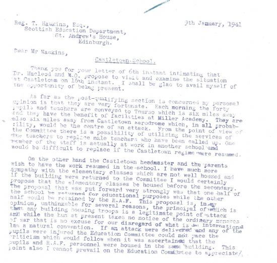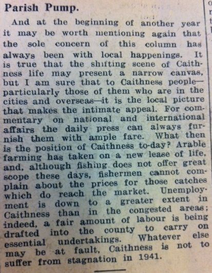 The John O’Groat Journal this week summed up the general position in Caithness at the start of the New Year, and found reasons for optimism: “Arable farming has taken on a new lease of life, and, although fishing does not offer great scope these days, fishermen cannot complain about the prices for those catches which do reach the market.” Unemployment was down, and labour was even being drafted into the county. “Whatever else may be at fault, Caithness is not to suffer from stagnation in 1941.” The Director of Education this week expressed his exasperation with proposals for the R.A.F. and the school to share Castletown School building. “This proposal is, in my opinion, unthinkable for several reasons, the principal of which is that any building housing troops is a legitimate point of attack and while the Hun at present takes no notice of the ordinary menaces of war that is no excuse for our disregard of what is in international law a natural convention… I cannot prevail on the Education Committee to appreciate [this].” Still on the subject of education, the Council had long enforced a policy of not employing married women as teachers – one lady on the point of marriage was asked to resign last year. There is a certain irony, therefore, in a letter from the Director on 9 January in which he is forced to admit, “I am sorry that in this county we are just keeping our heads above water with the assistance of married women. There is no surplus teacher in the county as far as I am aware.”Finally this week, it was announced that the traditional cabaret and supper for Old New Year’s Day (on 12