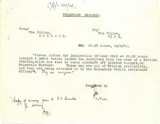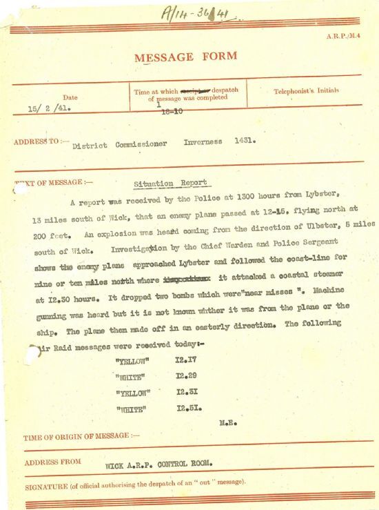 Shipping off Caithness was still at risk of attack by German planes. On 12 February the police recorded, “At 22.30 hours tonight a naval vessel landed ten survivors from the crew of a British trawler, which was sunk by enemy aircraft off Lybster tonight, at Helmsdale Harbour … They are uninjured.”Then, on 15 February, “A report was received by the Police at 1300 hours from Lybster … that an enemy plane passed at 12.15, flying north at 200 feet. An explosion was heard coming from Ulbster … the enemy plane approached Lybster and followed the coast-line for nine or ten miles north where it attacked a coastal steamer as 12.30 hours. It dropped two bombs which were “near misses”. Machine gunning was heard but it is not known whether it was from the plane or the ship.”