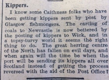 replied: “Approximately one hundred and twenty children in Thurso, one hundred and fifty in Lybster, thirty in Wick and twenty in Keiss have a hot plate of soup at mid-day.” There was scope for cookery demonstrations to be arranged for local women’s societies. “I propose to ask the teachers if they could give a special demonstration on the use of oatmeal, potatoes and vegetables.”Finally, the John O’Groat Journal reported that, now that “the great herring centre of the North has fallen on evil days”, Glasgow fishmongers were sending kippers by post to Caithness (“the carting of coals to Newcastle is now bettered by the posting of herring to Wick”). “When again”, they wondered, “will the time be when the port will be sending its kippers all over Scotland instead of getting the process reversed with the aid of the Post Office?”