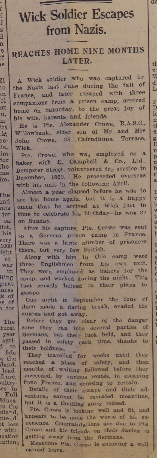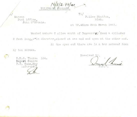 had been captured in the fall of France in the summer of 1940. Private Alexander Crowe had been a baker in civilian life, and when he was placed in a prison camp he was put to work there as a baker, working nights with three Englishmen from his own unit. “One night in September the four of them made a daring break, evaded the guards and got away. Before they got clear of the danger zone they ran into several parties of Germans, but their luck held and they passed in safety each time, thanks to their boldness.” Another mine was washed ashore on the Caithness coast on 29 March, two miles south of Duncansby Head: “a cylinder 2 feet long, 9 inches in diameter, closed at one end and open at the other end. At the open end there is a bar screwed down by two screws.”Finally this week, it appears that vandalism is not an altogether modern problem. The John