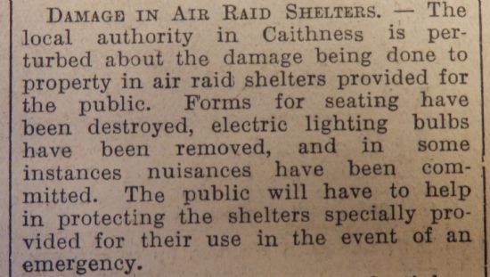 O’Groat Journal reported that “the local authority in Caithness is perturbed about the damage being done to property in air raid shelters provided for the public.” It itemised the damage: “Forms for seating have been destroyed, electric lighting bulbs have been removed, and in some instances nuisances have been committed. The public will have to help in protecting the shelters specially provided for their use in the event of an emergency.”