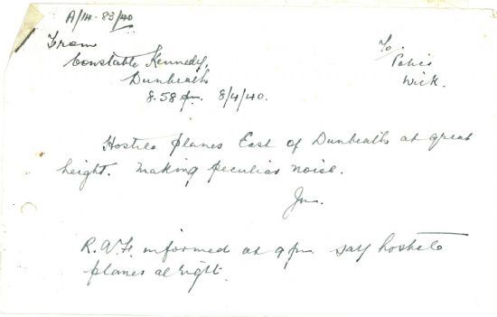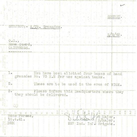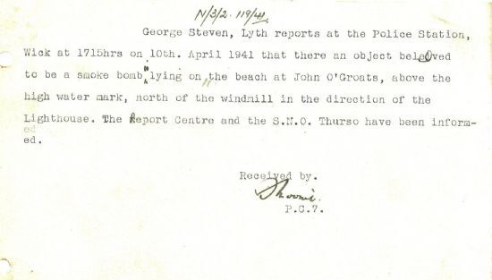 The Caithness coastline was threatened by sea, as well as from the air. Wick Police received the following report on 10 April: “George Steven, Lyth reports at the Police Station, Wick at 1715 hrs on 10th. April 1941 that there [is] an object believed to be a smoke bomb lying on the beach at John O’Groats, above the high water mark, north of the windmill in the direction of the Lighthouse. The Report Centre and the S.N.O. Thurso have been informed.”No one knew that Hitler had decided to call off the invasion of Britain and was now planning to attack Russia instead. The Home Guard continued to prepare for the worst, and to build up arms in case of an invasion. On 10 April the Wick commander of the Home Guard was informed in a memorandum marked “Secret”: “1. You have been allotted four boxes of hand grenades No. 73 H.E. [high explosive] for use against tanks. 2. These are to be used in the area of WICK.”