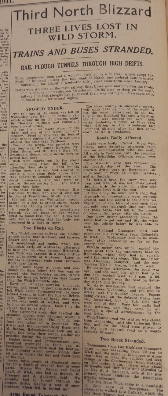 Caithness was recovering from its third great snowstorm of the year. As the John O’Groat Journal reported, a blizzard had swept the north of Scotland, isolating Caithness and Sutherland for a whole week and causing the deaths of three people – two men and a woman, all of whom were lost when they went out into the storm to tend their sheep. The railway line was blocked in two places, at Kinbrace and between Rogart and Lairg. The snow was so deep that it was possible for a man to stand on it and wrap his arms around the telegraph wires.German planes continued to harass the county. At 8.58pm on Tuesday 8 April Constable Kennedy of Dunbeath reported: “Hostile planes east of Dunbeath at great height, making peculiar noise. RAF informed at 9pm,say hostile planes alright.”