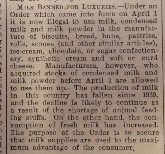 Finally this week there was another sign that the German blockade was taking effect. The John O’Groat Journal reported that “it is now illegal to use milk, condensed milk and milk powder in the manufacture of biscuits, breads, buns, pastries, rolls, scones (and other similar articles), ice-cream, chocolate or sugar confectionery, synthetic cream and soft or curd cheese.” Leaving aside the challenges involved in milk-free ice-cream, the intention was to build up stocks of condensed milk and cheese for the winter.