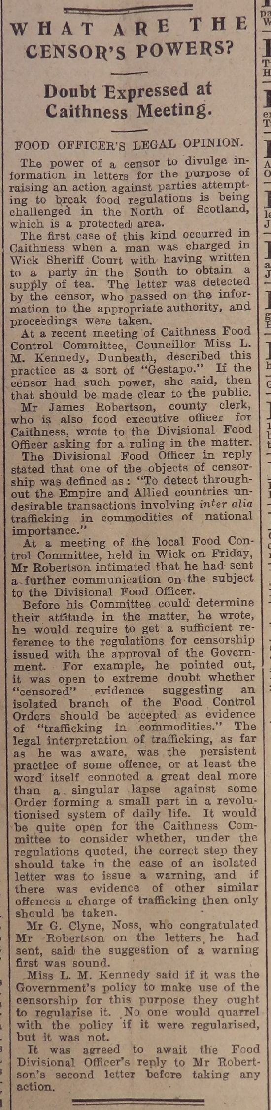 to complain about the use being made of the hall by the local platoon. “I … gave the key of the hall to some of the home guard at their request over a year ago. Since then they have been using the hall without asking or obtaining authority to do so. To bring matters to a head at the request of the Committee I held back the key & when they called here for it I told them they had to get some authority to answer for the damage they were doing the hall & pay some of the expenses so they told me to apply to you.” Finally this week, the John O’Groat Journal reported on a controversy involving the powers of the censor. A Caithness man had written to someone outside the county trying to obtain a supply of tea. The letter was read by the official censor, who passed it on to the authorities – as a result the man was prosecuted in Wick Sheriff Court for attempting to break food regulations. Local councillors protested (“Miss L. M. Kennedy, Dunbeath, described this practice as a sort of Gestapo”) and questioned the ethics of the censor also acting as an informer. The Caithness Food Control Committee thought that in future a warning might be more appropriate for a first offence.