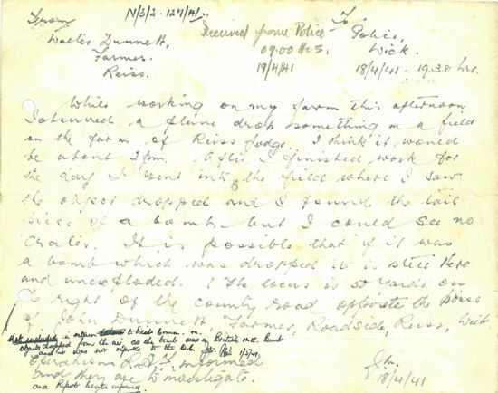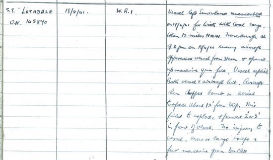 The Receiver of Wrecks noted a dramatic attack (and a lucky escape) at sea in an entry about the SS Lothdale this week in his log: “Vessel left Sunderland unescorted on 17/4/41 for Wick with coal cargo. When 12 miles N.N.W. Fraserburgh at 9.00 pm on 18/4/41 evening aircraft approached vessel from stern & opened up machine gun fire. Vessel replied. Both vessel and aircraft hit. Aircraft then dropped bomb or aerial torpedo about 12 feet from ship. This failed to explode & passed 2 or 3 feet in front of vessel. No injury to vessel, crew or cargo except a few machine gun bullets”The same day Walter Dunnett, a farmer at Reiss, contacted the Wick Police to report another bomb. “While