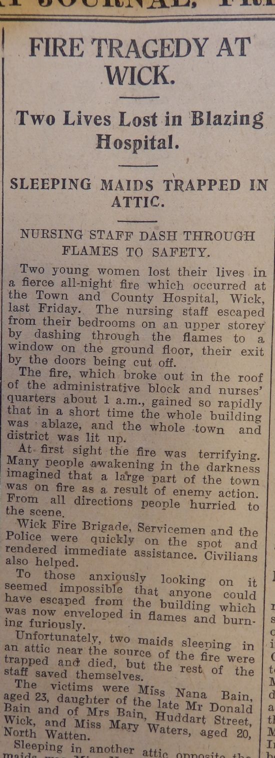 The John O’Groat Journal reported a tragic fire at Wick, when the Town and County Hospital caught fire and two young women, maids who slept in the attic, lost their lives. The story explained that “The fire, which broke out in the roof of the administrative block and nurses’ quarters about 1 a.m., gained so rapidly that in a short time the whole building was ablaze”. All the other staff escaped narrowly with their lives.