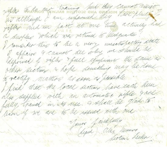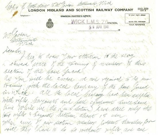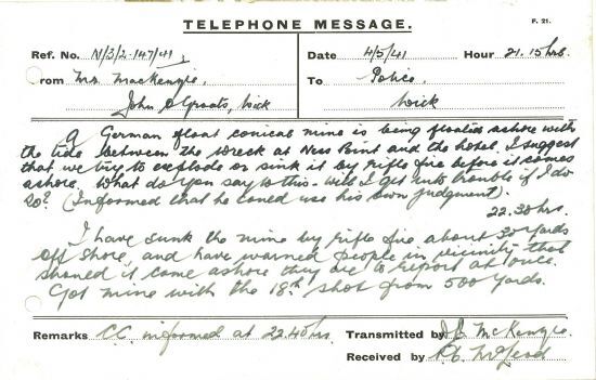 The London Midland and Scottish Railway Company had its own men in the Home Guard. Now the Section Leader at Wick wrote to protest that “All the local company have been supplied with rifles, bayonets and full equipment while we (the LMS section) have still rely the two rifles & bayonets between about 15 men.” When they turned up for drill they were treated as beginners because they didn’t have any weapons, and as a result were losing their enthusiasm.Another mine appeared off the Caithness coast on Sunday at 9.15pm, and was dealt with by a local marksman. The note of the call received by the police from Mr MacKenzie at John O’Groats is as follows: “A German float conical mine is being floated ashore with the tide between the wreck at Ness Point and the hotel. I suggest we try to explode or sink it by rifle fire before it comes ashore. What do you say to this. Will I get into trouble if I do so?” Told to use his own judgment, Mr MacKenzie reported back at 10.30pm. “I have sunk the mine by rifle fire about 30 yards off shore.” With a pardonable touch of pride he added, “Got mine with the 18th shot from 500 yards.”