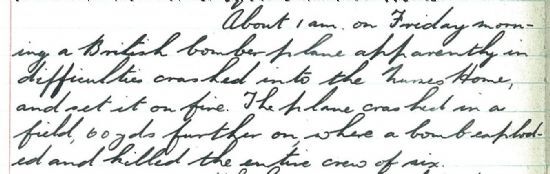 But what the paper was unable to print owing to wartime restrictions was that this was no ordinary fire. The Caithness Police incident book tells the dreadful story: “About 1 am on Friday Morning a British bomber plane apparently in difficulties crashed into the Nurses’ Home and set it on fire. The plane crashed in a field 60 yards further on where a bomb exploded and killed the entire crew of six.”