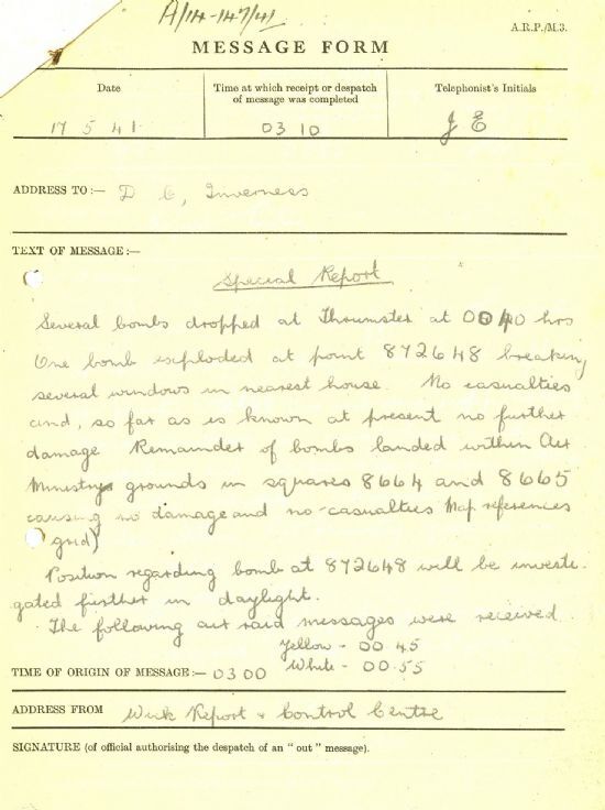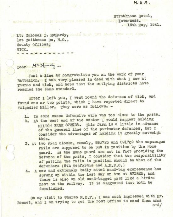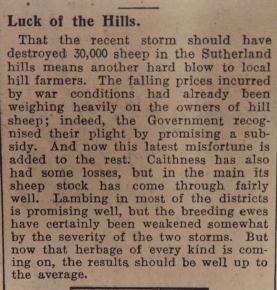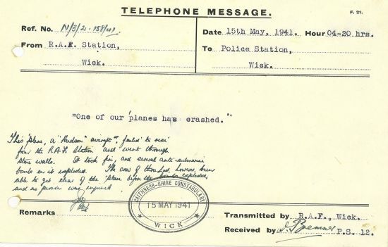 The John O’Groat Journal reported the severe cost of the recent snowstorms to the farmers of the North Highlands, especially in Sutherland. “That the recent storm should have destroyed 30,000 sheep in the Sutherland hills means another hard blow to local hill farmers.” The paper noted that Caithness had not suffered so badly, “but the breeding ewes have certainly been weakened somewhat by the severity of the two storms. But now that herbage of every kind is coming on, the results should be well up to the average.” The Wick Home Guard had been inspected by a colonel from Inverness. In a letter dated 15 May the colonel wrote to congratulate the battalion. He made a couple of suggestions, such as the importance of defending Milton Farm, but one thing in particular incurred his displeasure: “A new and extremely badly sited sand-bag excrescence has sprung up within the last day or two at 873825, and there is also an old sand-bagged post like a bird’s nest on the railway. It is suggested that both be demolished.” Also on 15 May the police received a terse and dramatic telephone message from RAF Station, Wick, “One of our ’planes has crashed”. A note in the margin reads: “This ’plane, a “Hudson” aircraft, failed to rise from the RAF Station and went through stone walls. It took fire, and several anti-submarine bombs on it exploded. The crew of three had, however, been able to get clear of the ’plane before the bombs exploded, and no person was injured.”The RAF had established several bombing decoys, or dummy airfields, across the county, in the hopes that the