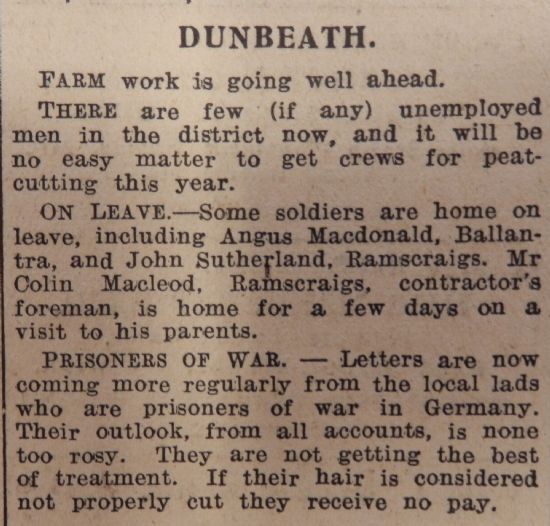 Luftwaffe would bomb the dummies instead of the real airfields. One of these was decoys was at Sarclet, and this may be the reason why Thrumster, which is near to Sarclet, was bombed on 17 May: “Several bombs dropped at Thrumster at 0040 hours. One bomb exploded … breaking several windows in nearest house. No casualties and, so far as is known at present, no further damage. Remainder of bombs landed within Air Ministry grounds … causing no damage and no casualties.” Finally this week the local news from Dunbeath in the John O’Groat Journal reported that farm work was going well, but noted that, because there were so few unemployed men, it would be hard to find crews for peat-cutting. The piece concluded with news of “the local lads who are prisoners of war in Germany. Their outlook, from all accounts, is none too rosy. They are not getting the best of treatment. If their hair is considered not properly cut they receive no pay.”